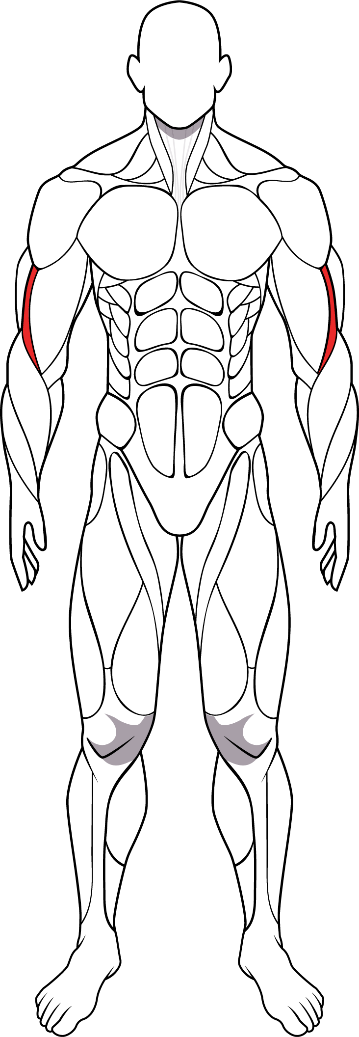 The brachialis is an elbow flexor that originates from the distal anterior humerus and inserts onto the ulnar tuberosity. The brachialis is one of the largest elbow flexors and provides pure flexion of the forearm at the elbow. It does not provide any supination or pronation of the forearm.